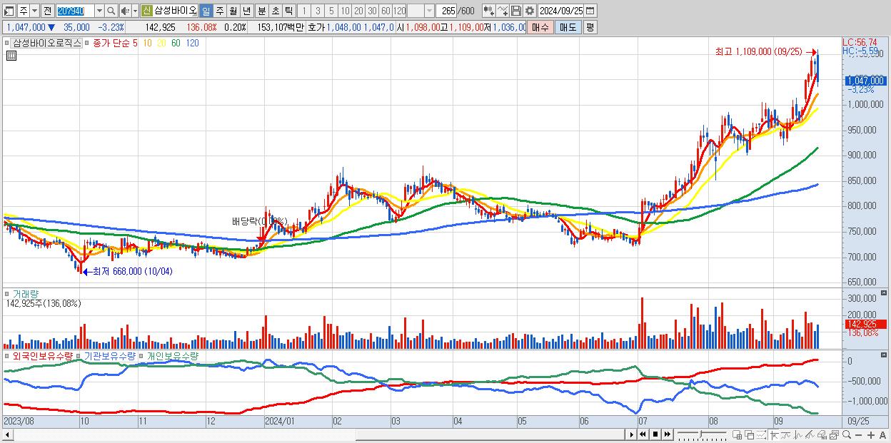- 삼성바이오로직스 (1,047,000원 ▼ -3.23% , 시총: 745,192억, 외국인 순매수 거래금:308억)