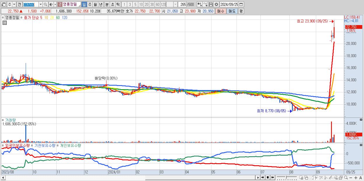 - 영풍정밀 (22,750원 ▲ 7.06% , 시총: 3,583억, 거래량: 1,606,300, 거래대금:357억, KOSDAQ)