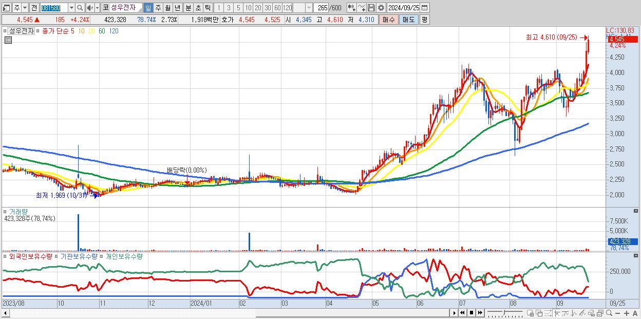 - 성우전자 (4,545원 ▲ 4.24% , 시총: 705억, 거래량: 423,328, 거래대금:19억, KOSDAQ)