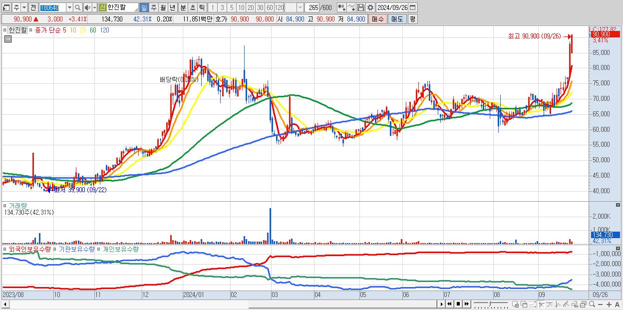 - 한진칼 (90,900원 ▲ 3.41% , 시총: 60,687억, 거래량: 134,730, 거래대금:119억, KOSPI)