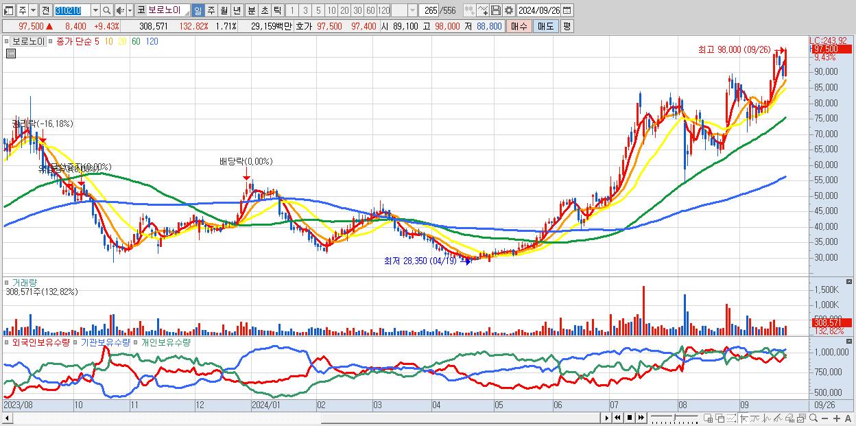 - 보로노이 (97,500원 ▲ 9.43% , 시총: 17,641억, 거래량: 308,571, 거래대금:292억, KOSDAQ)