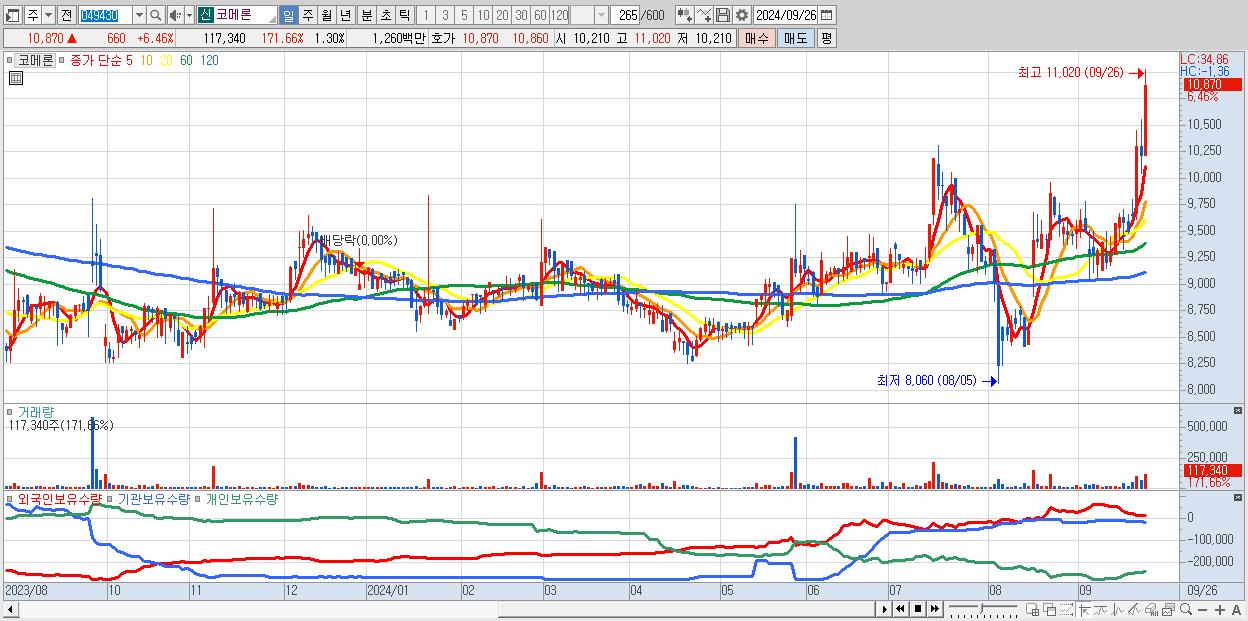 - 코메론 (10,870원 ▲ 6.46% , 시총: 984억, 거래량: 117,340, 거래대금:13억, KOSDAQ)