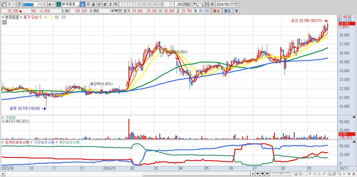- 부국증권 (29,300원 ▲ 2.45% , 시총: 3,038억, 거래량: 5,061, 거래대금:1억, KOSPI)