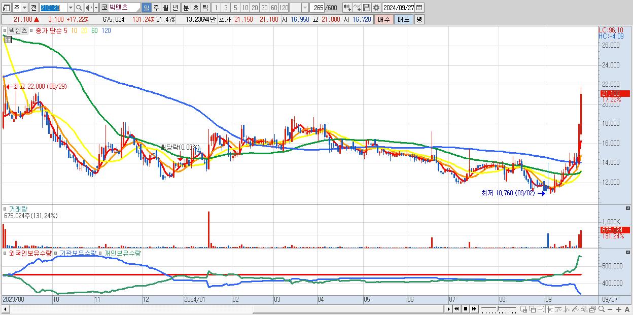 - 빅텐츠 (21,100원 ▲ 17.22% , 시총: 664억, 거래량: 675,024, 거래대금:132억, KOSDAQ)