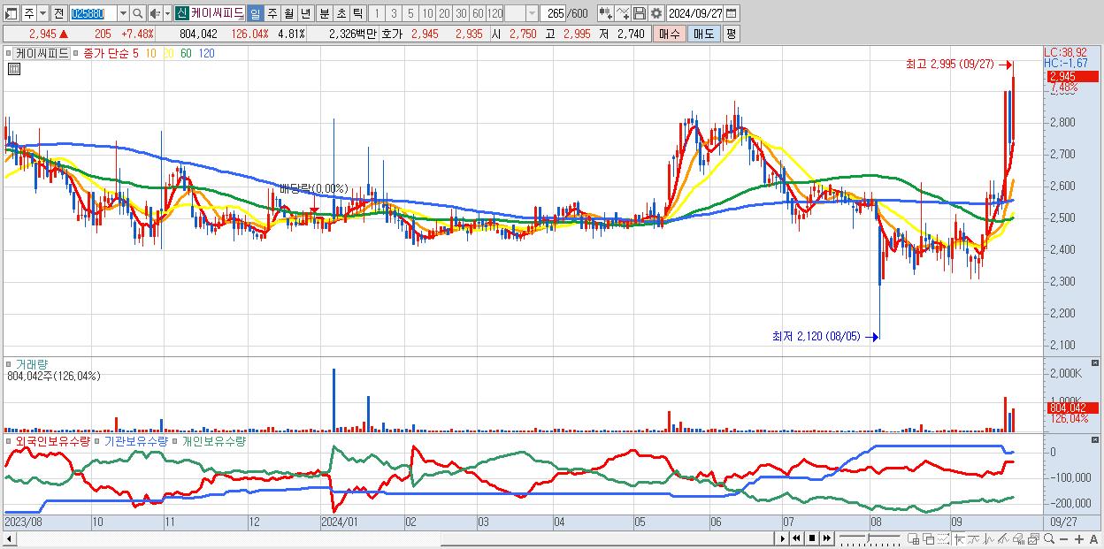 - 케이씨피드 (2,945원 ▲ 7.48% , 시총: 492억, 거래량: 804,042, 거래대금:23억, KOSDAQ)