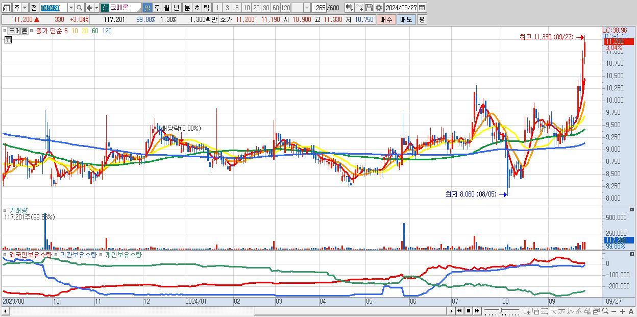 - 코메론 (11,200원 ▲ 3.04% , 시총: 1,013억, 거래량: 117,201, 거래대금:13억, KOSDAQ)