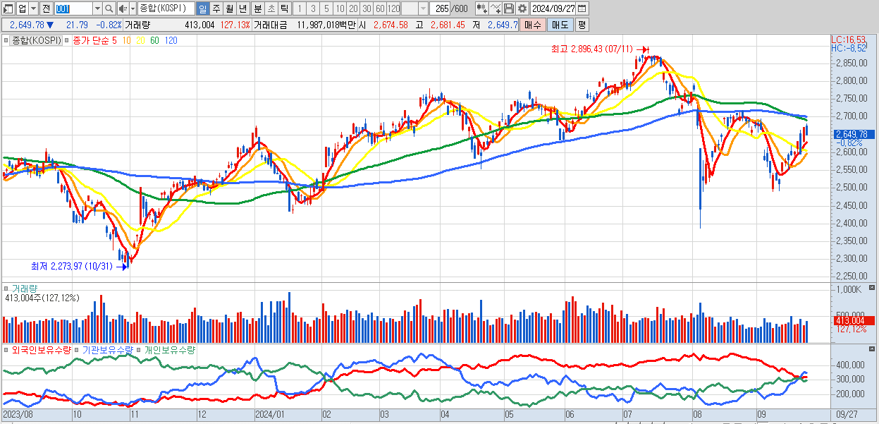 | 09/24 | 2,631.68 | ▲1.14% | -2,101억 | -3,790억 | 5,721억 | 169억 |