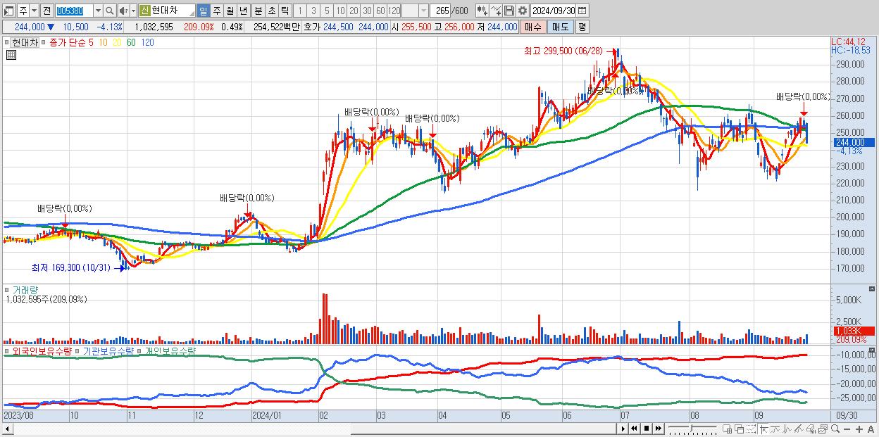 - 현대차 (244,000원 ▼ -4.13% , 시총: 510,976억, 거래량: 1,032,595, 거래대금:2,545억)