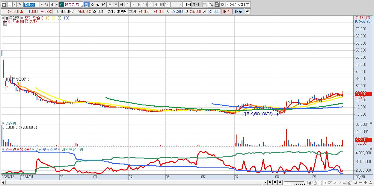 - 블루엠텍 (24,300원 ▲ 4.29% , 시총: 2,714억, 거래량: 8,830,047, 거래대금:2,211억)