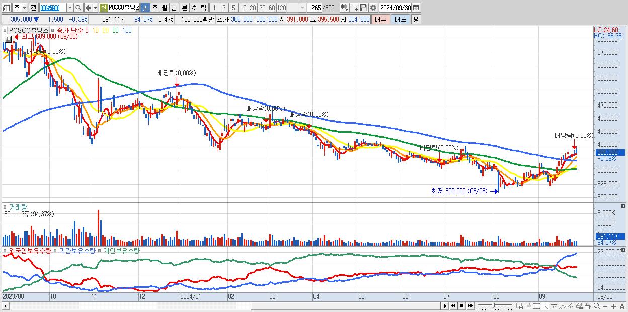 - POSCO홀딩스 (385,000원 ▼ -0.39% , 시총: 318,104억, 거래량: 391,117, 거래대금:1,523억)