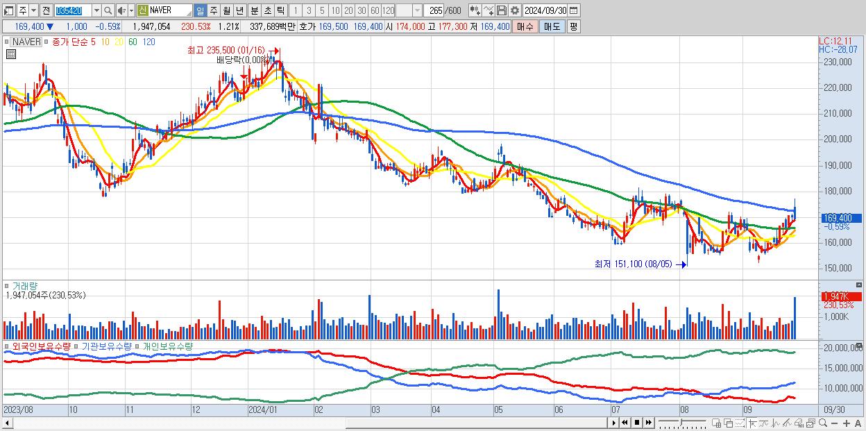 - NAVER (169,400원 ▼ -0.59% , 시총: 272,369억, 거래량: 1,947,054, 거래대금:3,377억)
