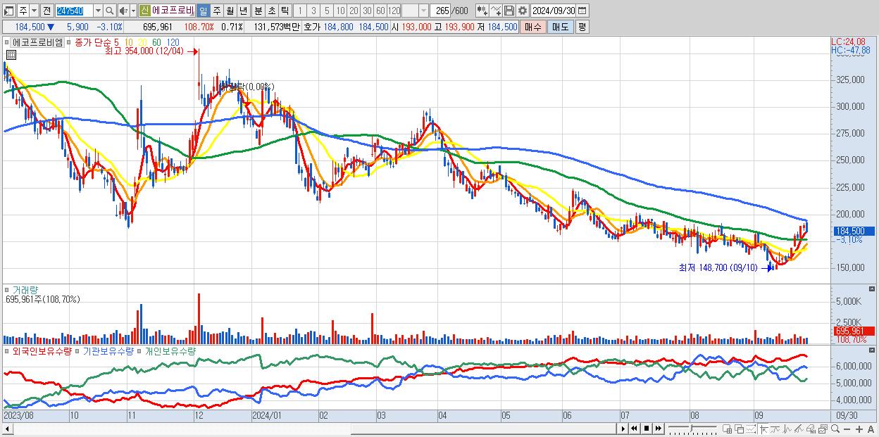 - 에코프로비엠 (184,500원 ▼ -3.1% , 시총: 180,443억, 거래량: 695,961, 거래대금:1,316억)