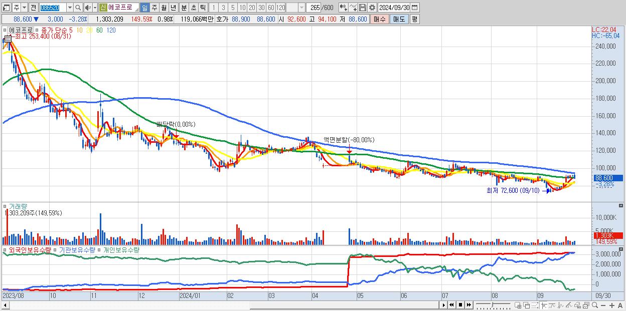 - 에코프로 (88,600원 ▼ -3.28% , 시총: 117,961억, 거래량: 1,303,209, 거래대금:1,191억)