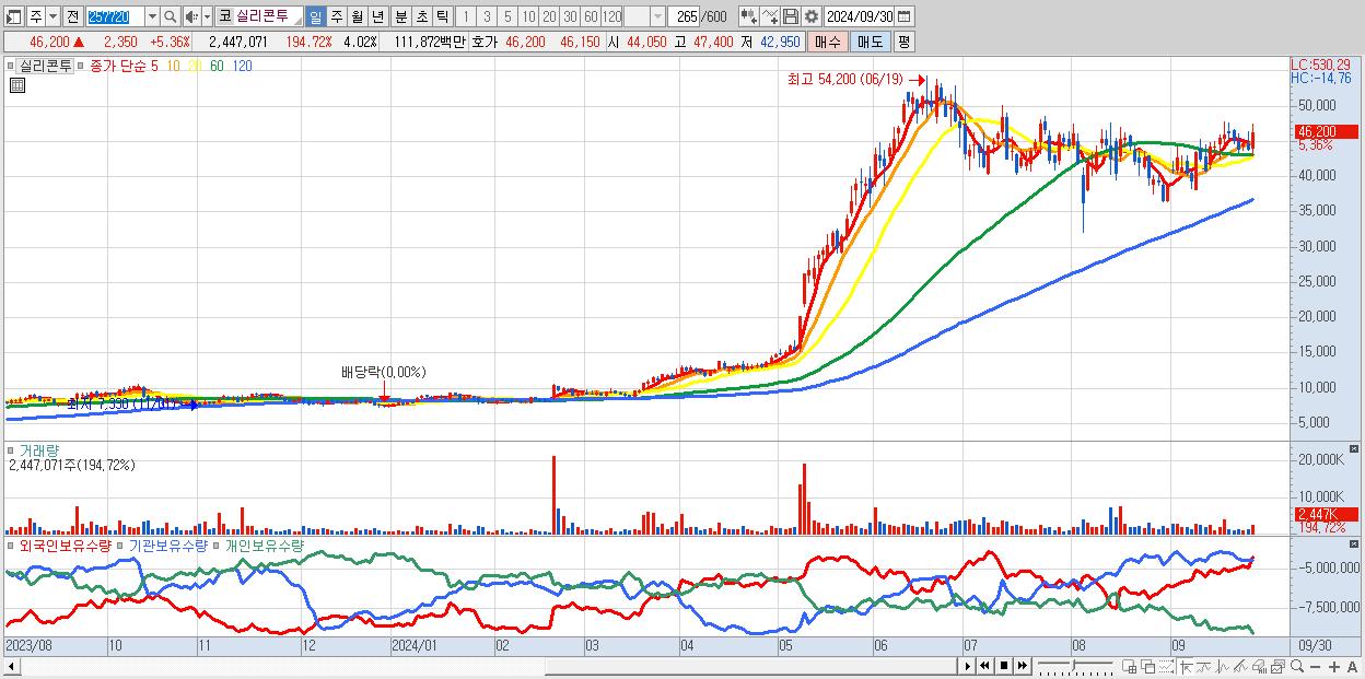 - 실리콘투 (46,200원 ▲ 5.36% , 시총: 28,123억, 거래량: 2,447,071, 거래대금:1,119억)