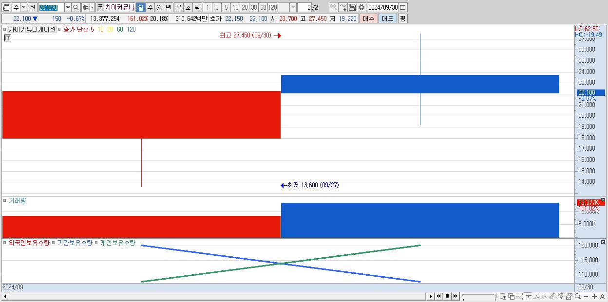 - 차이커뮤니케이션 (22,100원 ▼ -0.67% , 시총: 2,460억, 거래량: 13,377,254, 거래대금:3,106억)