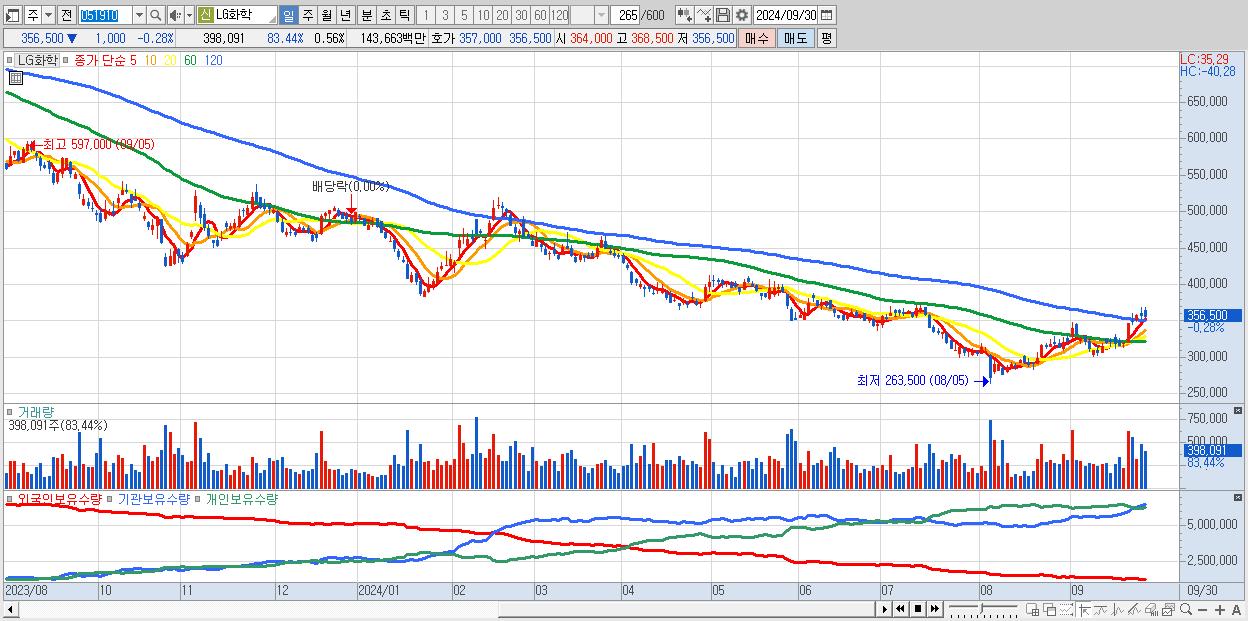- LG화학 (356,500원 ▼ -0.28% , 시총: 251,662억, 거래량: 398,091, 거래대금:1,437억)