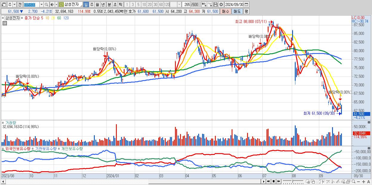 1.삼성전자 61,500원 ▼ -4.21% (KOSPI, 005930)