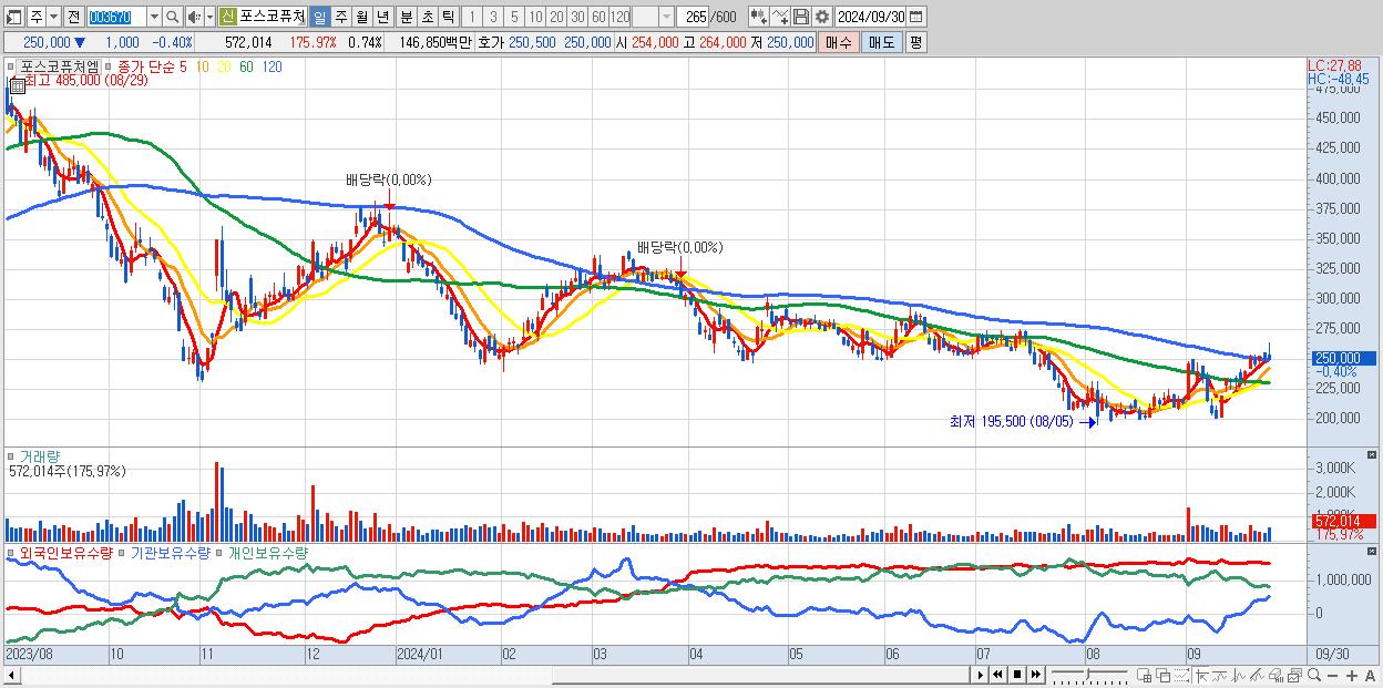 - 포스코퓨처엠 (250,000원 ▼ -0.4% , 시총: 193,658억, 거래량: 572,014, 거래대금:1,469억)