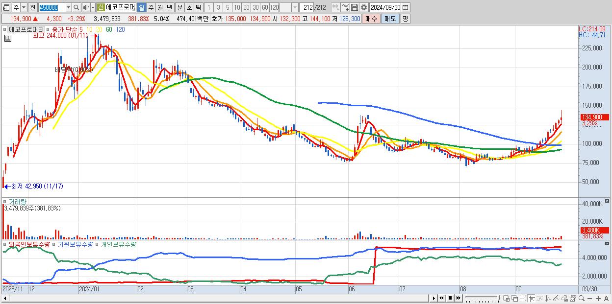 - 에코프로머티 (134,900원 ▲ 3.29% , 시총: 93,176억, 거래량: 3,479,839, 거래대금:4,744억)