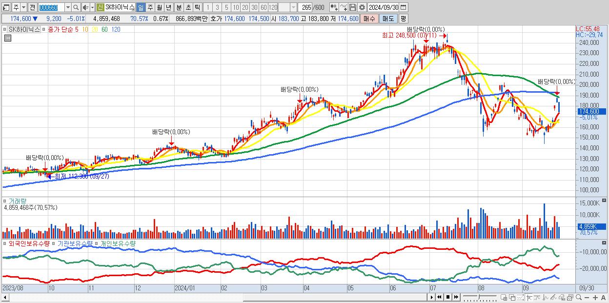 - SK하이닉스 (174,600원 ▼ -5.01% , 시총: 1,271,092억, 거래량: 4,859,468, 거래대금:8,669억)