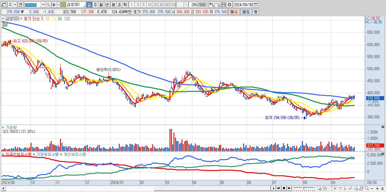- 삼성SDI (378,500원 ▼ -1.43% , 시총: 260,274억, 거래량: 323,768, 거래대금:1,244억)