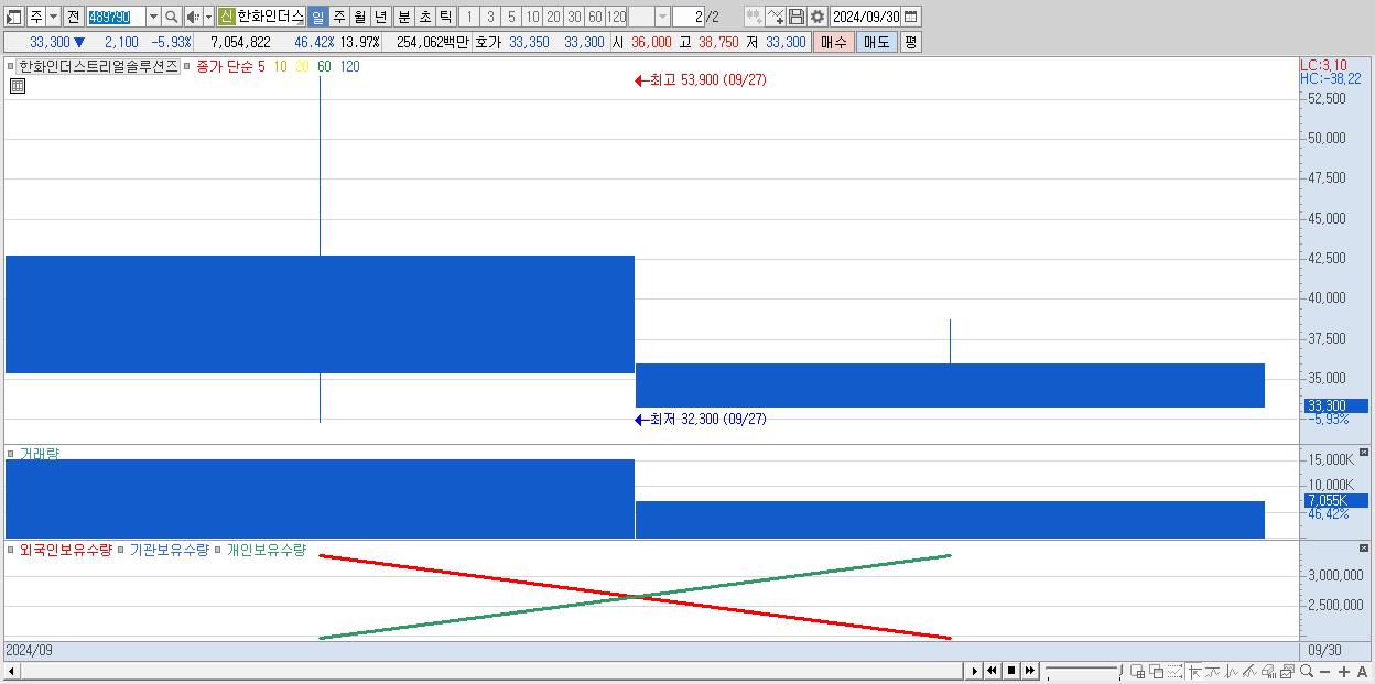 - 한화인더스트리얼솔루션즈 (33,300원 ▼ -5.93% , 시총: 16,813억, 거래량: 7,054,822, 거래대금:2,541억)