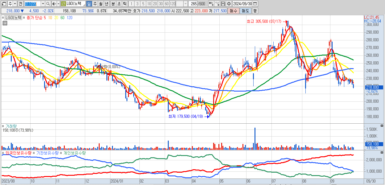- LG이노텍 (218,000원 ▼ -2.02% , 시총: 51,594억, 외국인 순매수 거래금:53억)