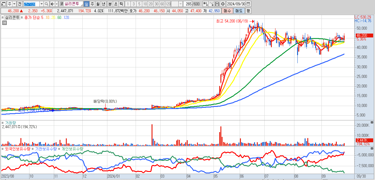 - 실리콘투 (46,200원 ▲ 5.36% , 시총: 28,123억, 외국인 순매수 거래금:242억)