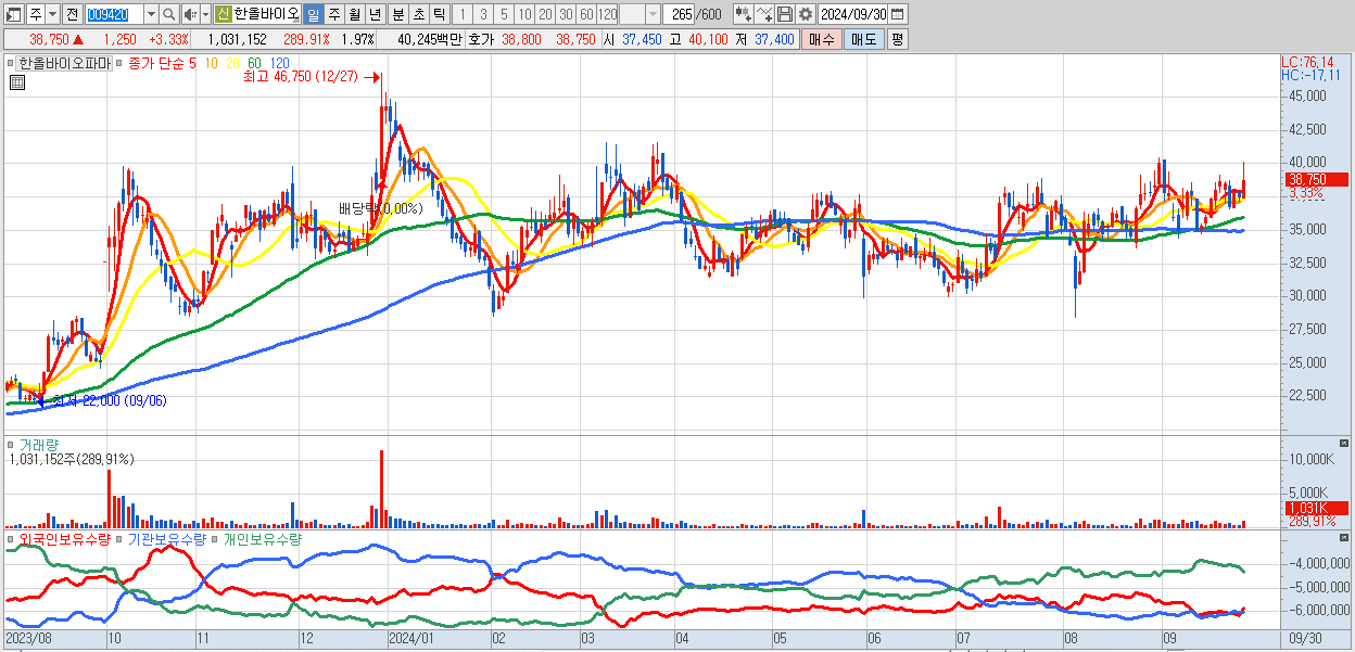 - 한올바이오파마 (38,750원 ▲ 3.33% , 시총: 20,243억, 외국인 순매수 거래금:94억)