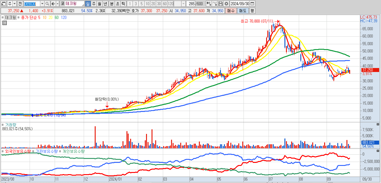 - 테크윙 (37,250원 ▲ 3.91% , 시총: 13,914억, 외국인 순매수 거래금:59억)
