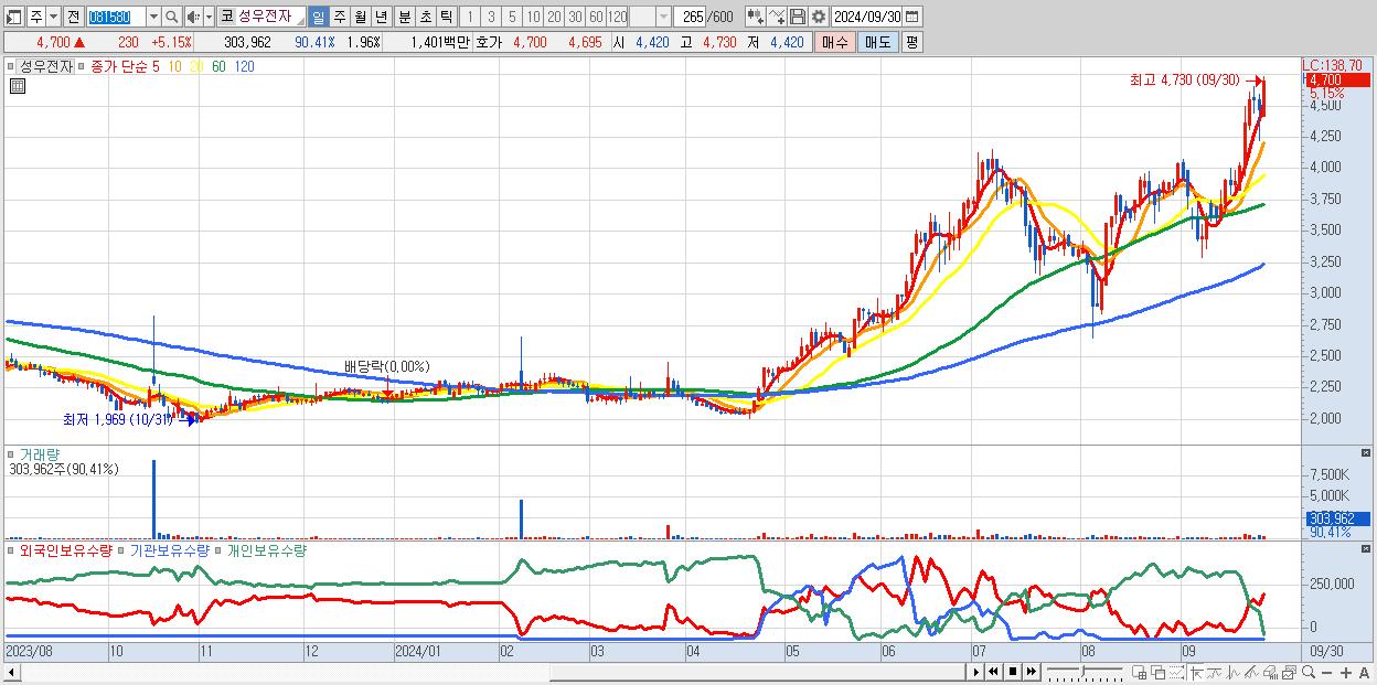 - 성우전자 (4,700원 ▲ 5.15% , 시총: 729억, 거래량: 303,962, 거래대금:14억, KOSDAQ)