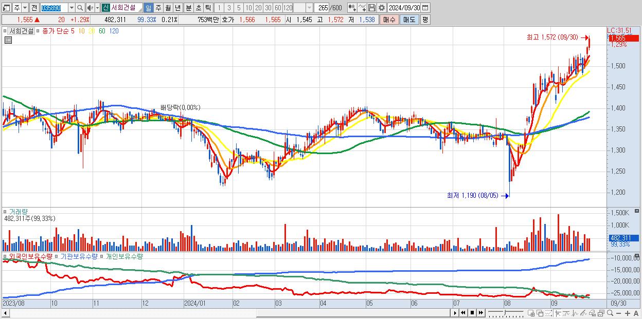- 서희건설 (1,565원 ▲ 1.29% , 시총: 3,597억, 거래량: 482,311, 거래대금:8억, KOSDAQ)