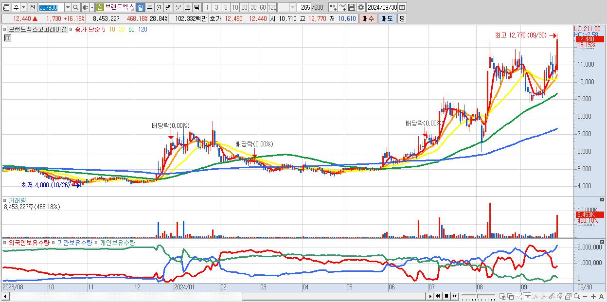 - 브랜드엑스코퍼레이션 (12,440원 ▲ 16.15% , 시총: 3,646억, 거래량: 8,453,227, 거래대금:1,023억, KOSDAQ)