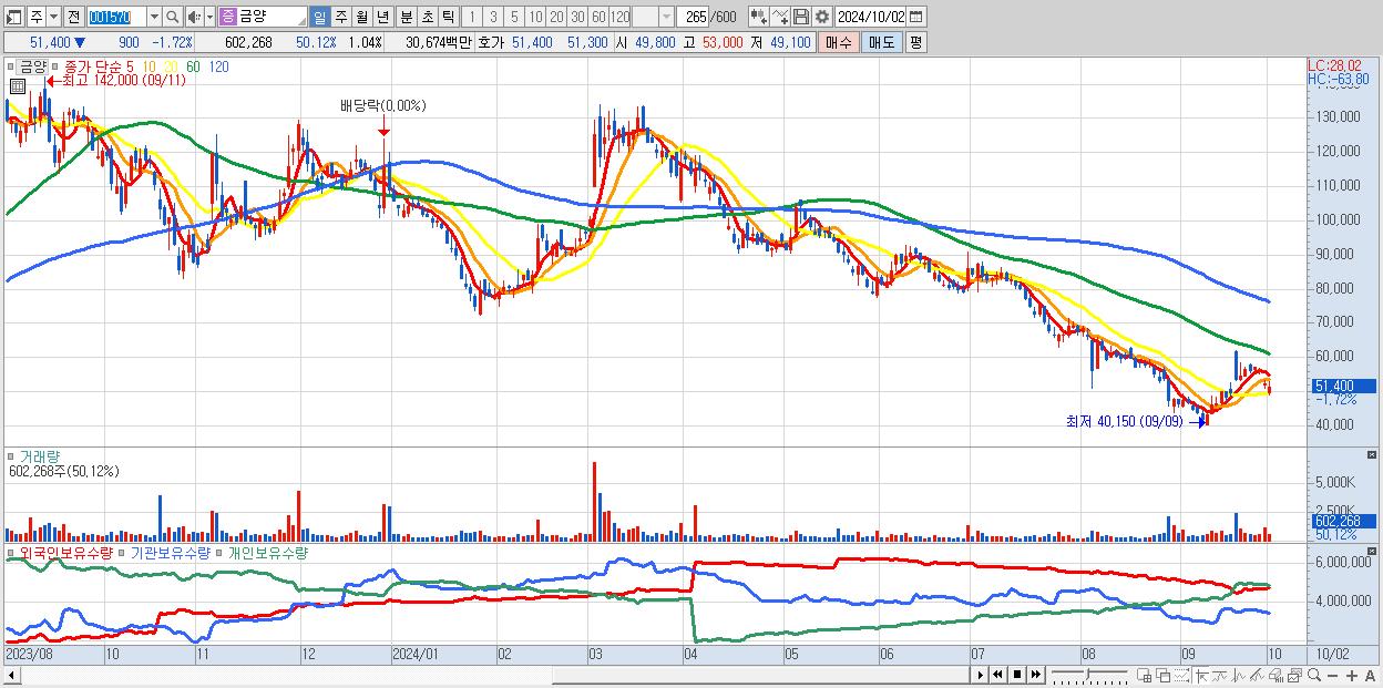 - 금양 (51,400원 ▼ -1.72% , 시총: 29,838억, 외국인 순매수 거래금:51억)