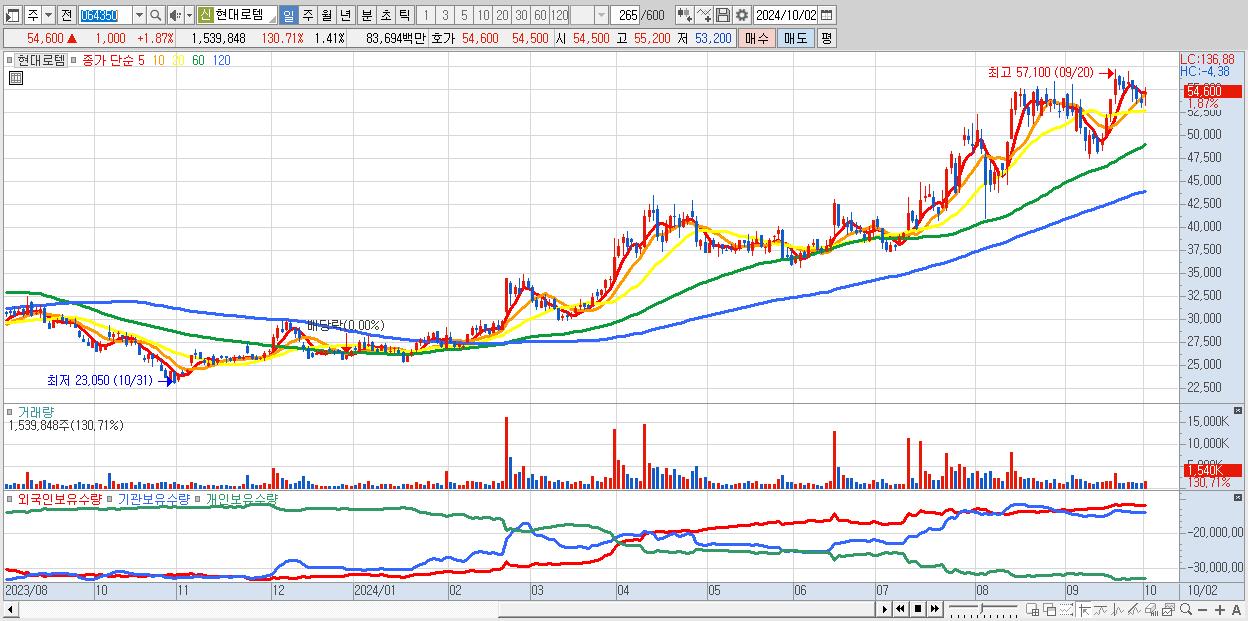 - 현대로템 (54,600원 ▲ 1.87% , 시총: 59,592억, 외국인 순매수 거래금:38억)