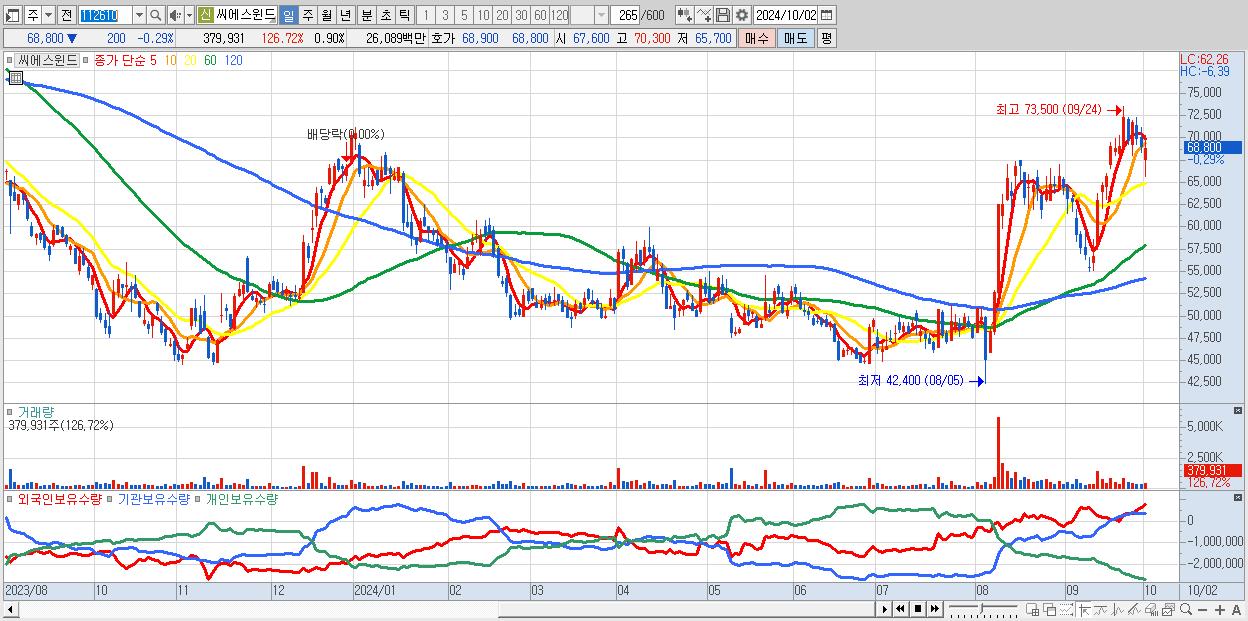 - 씨에스윈드 (68,800원 ▼ -0.29% , 시총: 29,014억, 외국인 순매수 거래금:44억)