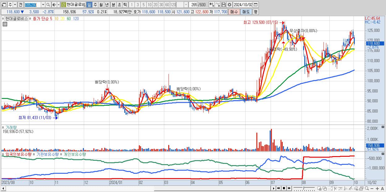 - 현대글로비스 (118,600원 ▼ -2.87% , 시총: 88,950억, 외국인 순매수 거래금:46억)