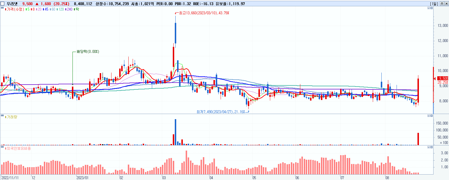 - 우리넷 (9,500원 ▲ 20.25% , 시총: 1,022억, 거래량: 8,422,598, 거래대금:778억)