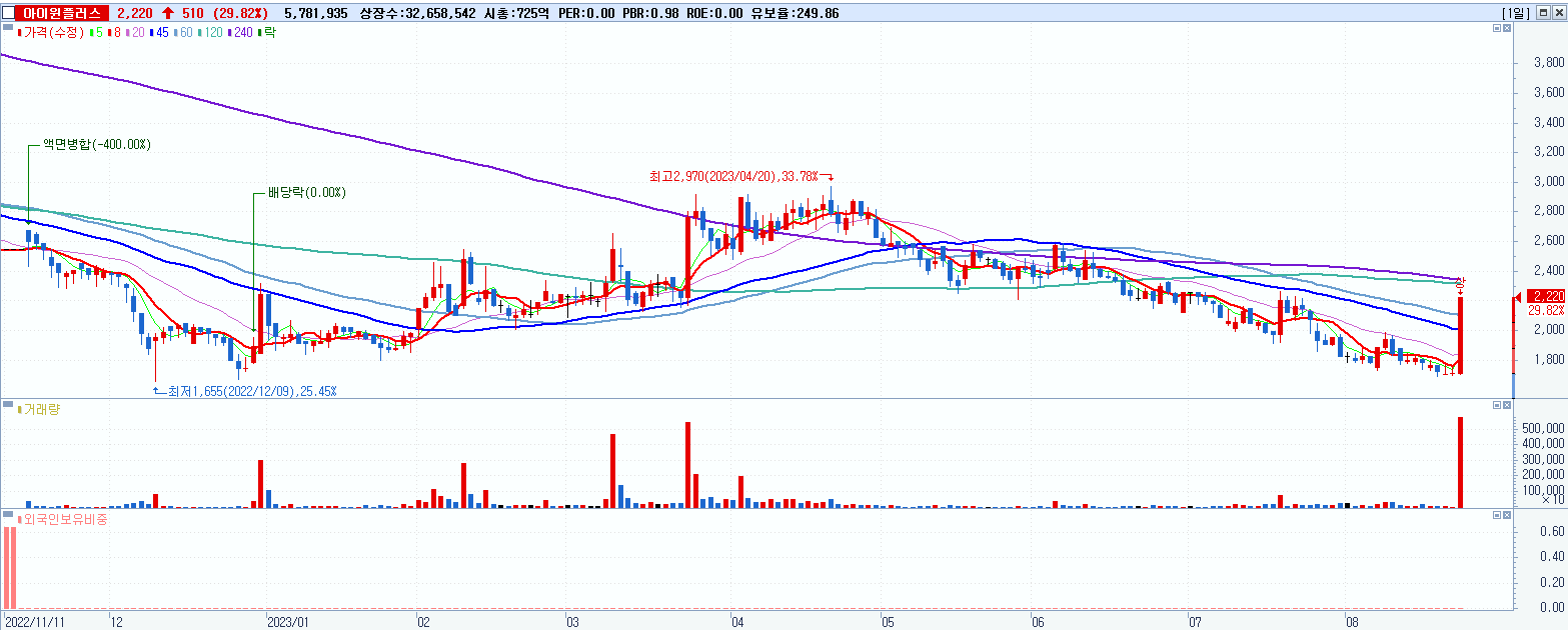 - 아이윈플러스 (2,220원 ▲ 29.82% , 시총: 725억, 거래량: 5,782,041, 거래대금:118억)
