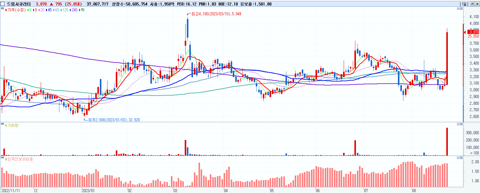 - 드림시큐리티 (3,870원 ▲ 25.85% , 시총: 1,958억, 거래량: 37,114,032, 거래대금:1,384억)