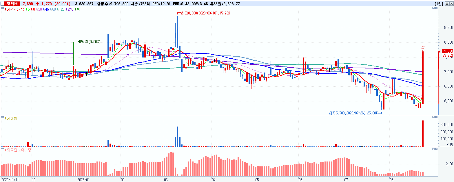 4.코위버 7,690원 ▲ 29.9% (KOSDAQ, 056360)