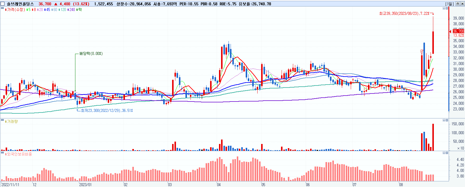 - 솔브레인홀딩스 (36,700원 ▲ 13.62% , 시총: 7,694억, 거래량: 1,522,853, 거래대금:563억)