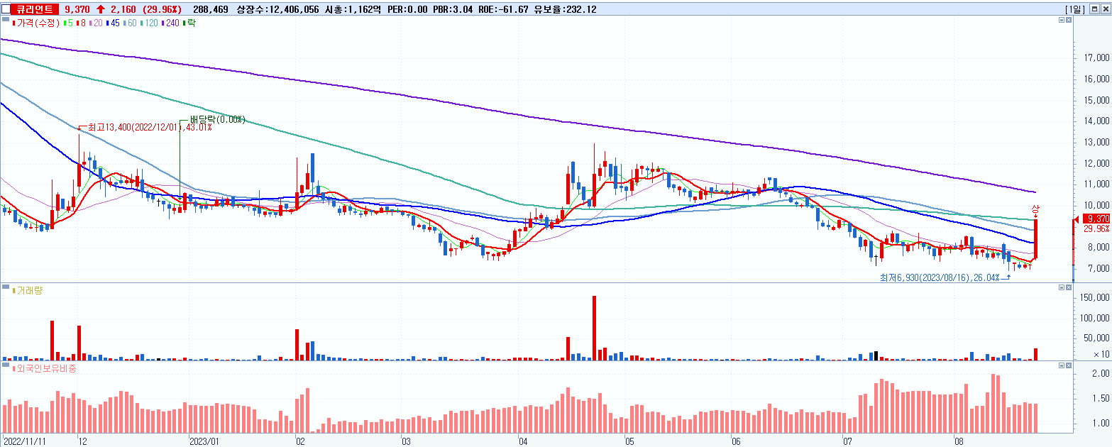 - 큐리언트 (9,370원 ▲ 29.96% , 시총: 1,162억, 거래량: 288,971, 거래대금:26억)