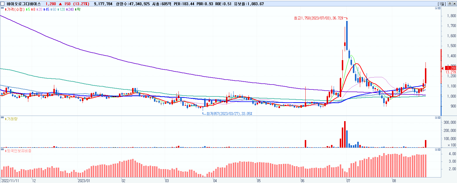 - 바이오로그디바이스 (1,280원 ▲ 13.27% , 시총: 606억, 거래량: 9,180,427, 거래대금:116억)