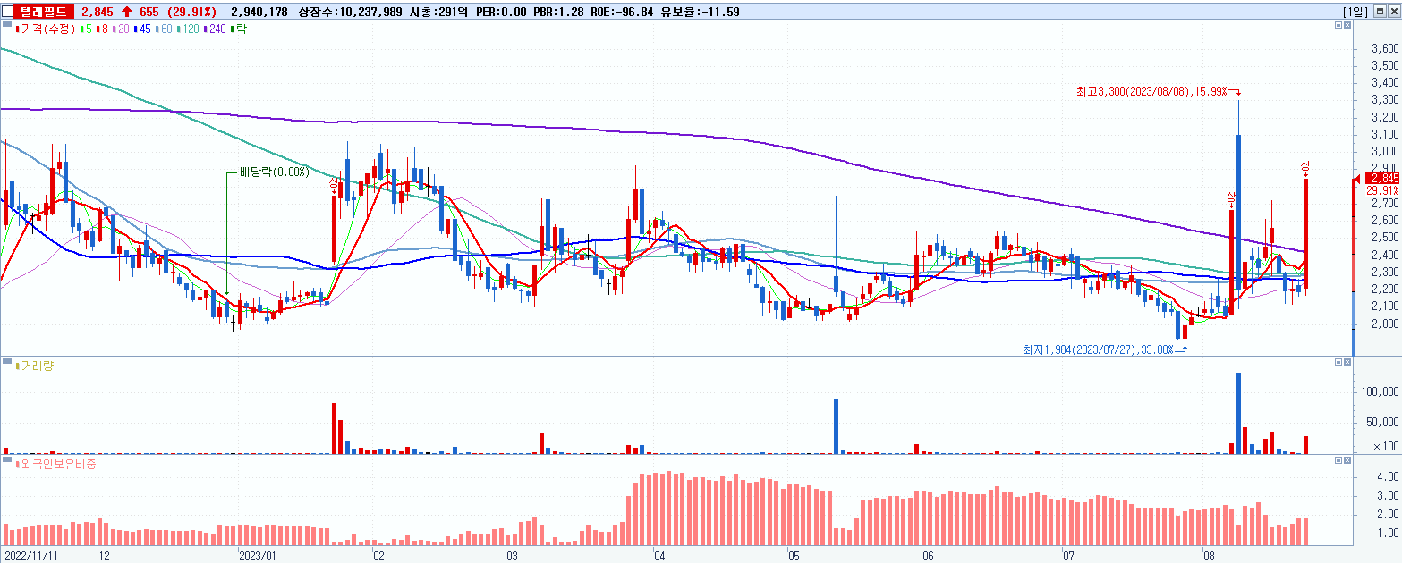 - 텔레필드 (2,845원 ▲ 29.91% , 시총: 291억, 거래량: 2,940,178, 거래대금:79억)