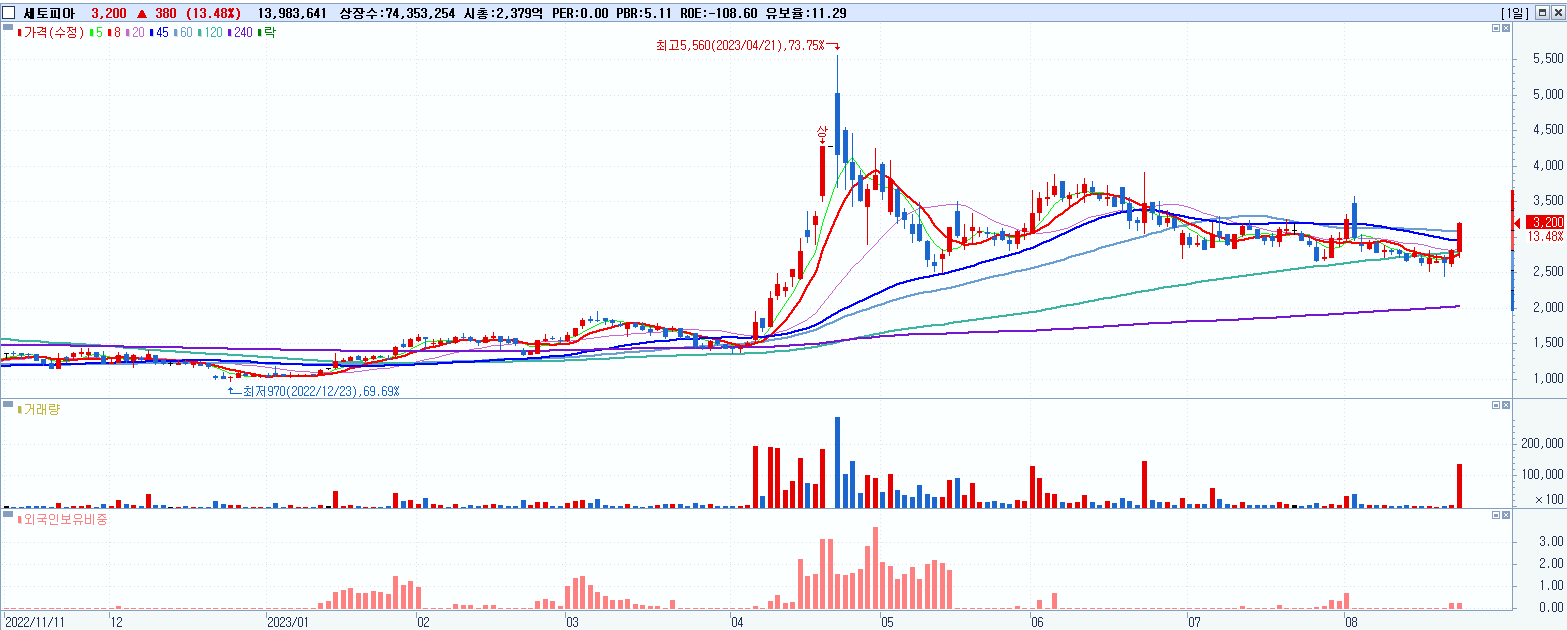 - 세토피아 (3,200원 ▲ 13.48% , 시총: 2,379억, 거래량: 14,001,633, 거래대금:430억)