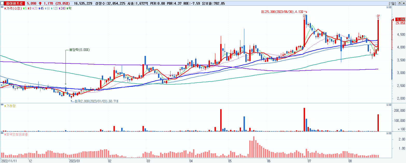 - 파이버프로 (5,090원 ▲ 29.85% , 시총: 1,672억, 거래량: 16,537,290, 거래대금:795억)