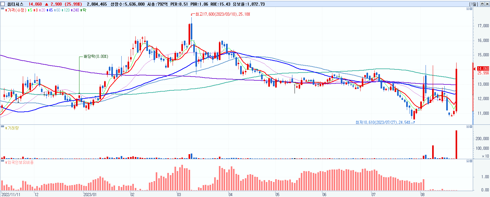 - 옵티시스 (14,060원 ▲ 25.99% , 시총: 792억, 거래량: 2,888,995, 거래대금:399억)