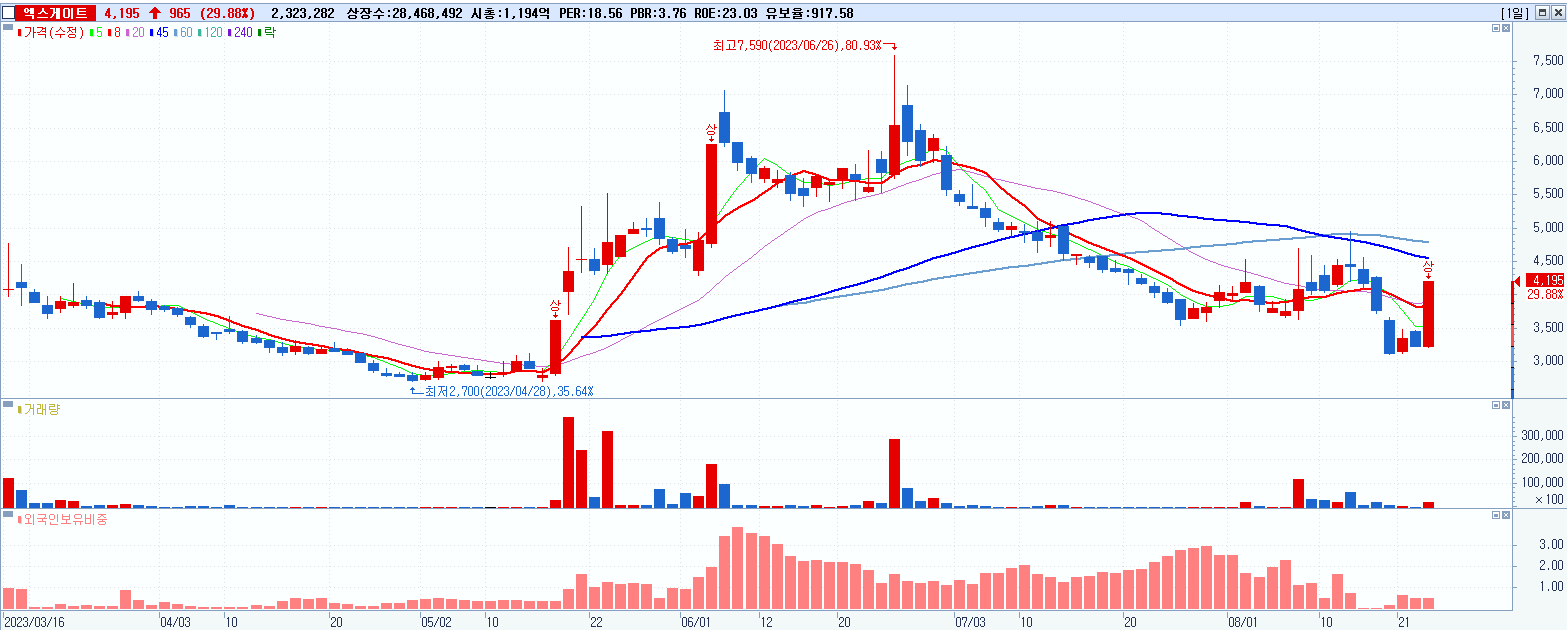 - 엑스게이트 (4,195원 ▲ 29.88% , 시총: 1,194억, 거래량: 2,323,784, 거래대금:92억)