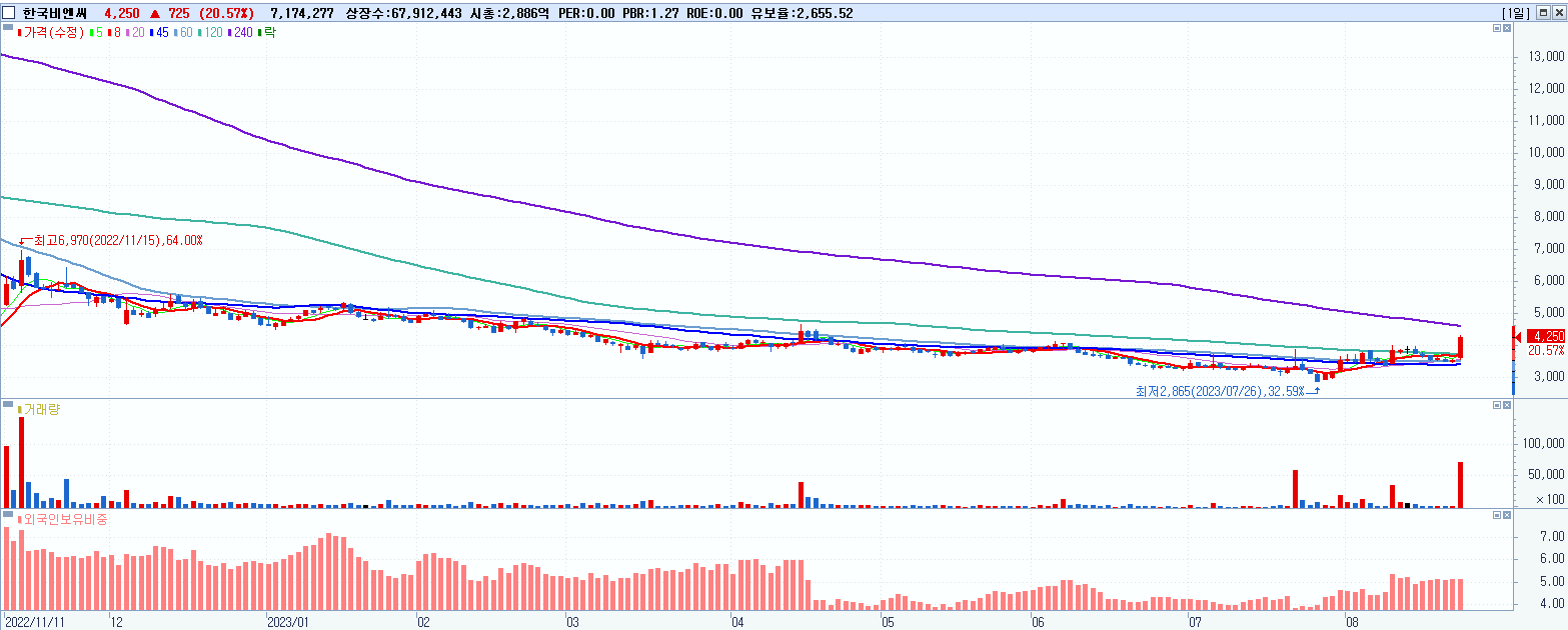 - 한국비엔씨 (4,250원 ▲ 20.57% , 시총: 2,886억, 거래량: 7,178,989, 거래대금:291억)